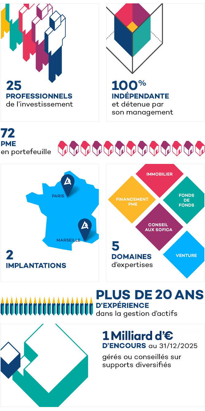 Depuis plus de 25 ans, A Plus Finance investit dans l’économie réelle à travers des actifs principalement non cotés. Les pôles d’expertises développés au sein de la société de gestion sont centrés sur l’Innovation, le Capital Transmission, l’Immobilier, le Conseil à la production et la distribution audiovisuelle et les Fonds de Fonds.